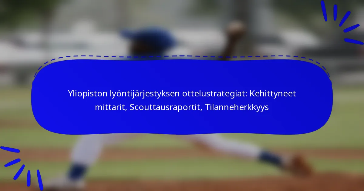 Yliopistobaseballissa tehokkaan lyöntijärjestyksen kehittäminen on ratkaisevan tärkeää, jotta voidaan maksimoida pistepotentiaali ja koko joukkueen suorituskyky. Hyödyntämällä edistyneitä mittareita, kuten on-base-prosenttia ja slugging-prosenttia, valmentajat voivat strategisesti optimoida kokoonpanoja. Lisäksi scouttausraportit tarjoavat arvokkaita näkemyksiä pelaajien kohtaamisista, kun taas tilanneherkkyys mahdollistaa reaaliaikaiset säädöt pelin dynamiikan mukaan. Nämä elementit yhdessä muodostavat kattavan lähestymistavan hyökkäyskyvyn parantamiseen.